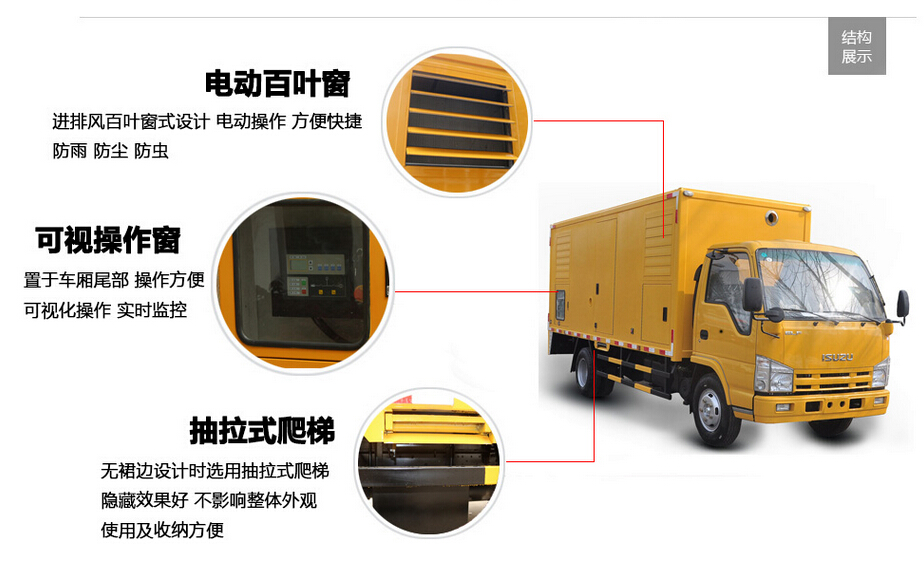 移動(dòng)電源車由二類汽車底盤,靜音廂體,柴油發(fā)動(dòng)機(jī),發(fā)電機(jī)組,控制系統(tǒng),內(nèi)外照明裝置,輸配電裝置,電纜卷盤,電源輸入,輸出接口,液壓支腿等構(gòu)成。